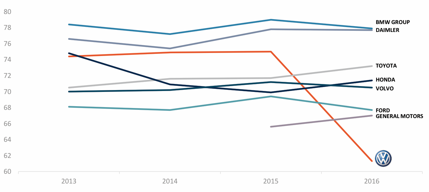 De la escala máxima de 100 puntos que una empresa puede obtener en el ranking, VW pasó de tener 75 puntos en 2015 a 61,3 puntos en 2016, lo cual supuso la caída desde el puesto 14 del ranking de empresas hasta el 123, nada menos que 109 puestos, dejando a VW fuera del Top 100 de empresas mundiales por culpa de una bajada generalizada de su reputación en 14 de los 15 mercados analizados en el estudio.