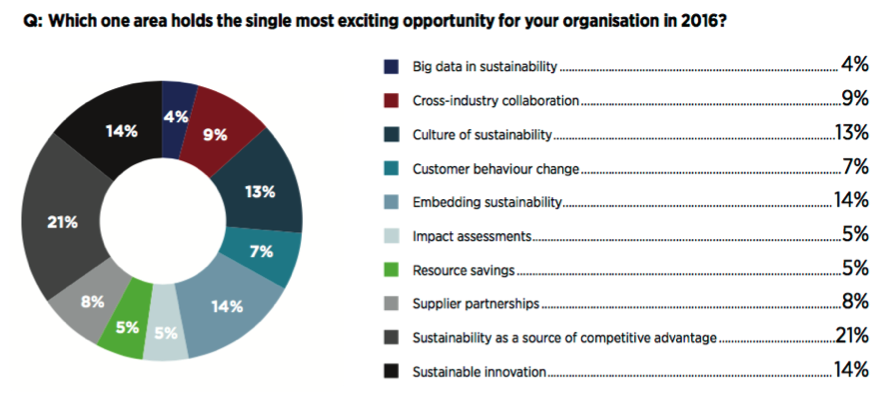 El 21% de los encuestados consideró a la sostenibilidad como una fuente de ventaja competitiva y como la oportunidad más apasionante para su organización para el año 2016.