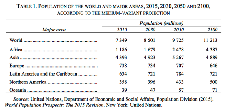 Según las estimaciones de la ONU en su informe “2015 Revision of World Population Prospects” en 2015 había en la Tierra 7.349 millones de habitantes y en 2100 habrá 11.213 millones, teniendo en cuenta un descenso de las tasas de fecundidad y un aumento de las expectativas de vida.