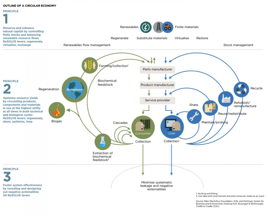 El sistema circular tiene dos ciclos de materiales. Uno de ellos, el ciclo biológico, se centra en devolver los residuos de vuelta a la naturaleza de una manera segura. El segundo es el ciclo técnico, que tiene por objeto garantizar que los productos y sus componentes están diseñados y comercializados de una manera que permite que sean reutilizados con la más alta retención de calidad posible.
