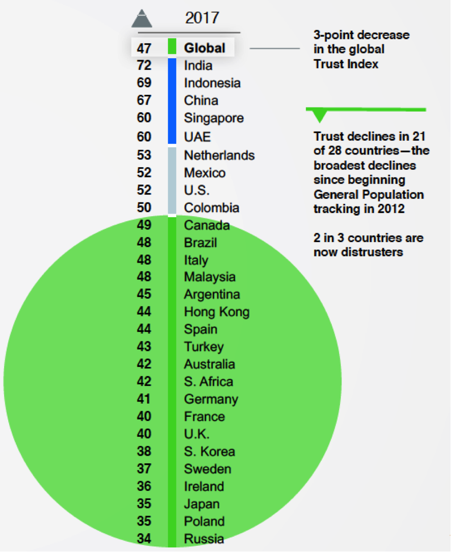 Confianza en las instituciones 2017 por países. Fuente: Edelman Trust Barometer 2017.