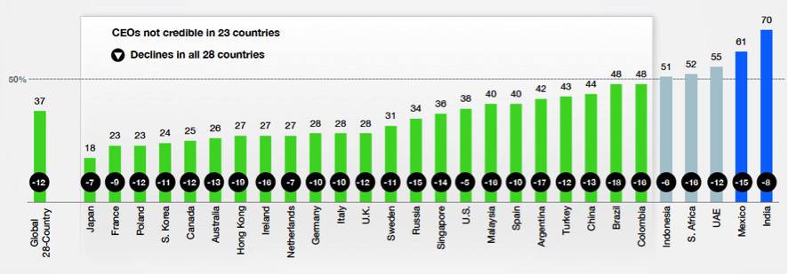 En segundo lugar, hay una falta de creencia en los líderes, que dañan la imagen de sus organizaciones. Casi dos tercios de la población general no confía en que los líderes actuales puedan abordar los desafíos de su país. La credibilidad de los CEO’s cayó en 12 puntos este año a 37% a nivel mundial. La credibilidad mínima se da en Japón con un 18%.