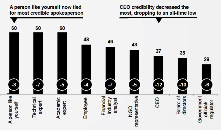 Las “personas como usted» son ahora tan creíbles como un experto académico o técnico, y mucho más creíbles que un CEO o funcionario del gobierno, lo que implica que el eje primario de las comunicaciones es ahora horizontal, evidenciando la dispersión de la autoridad hacia amigos y familiares.