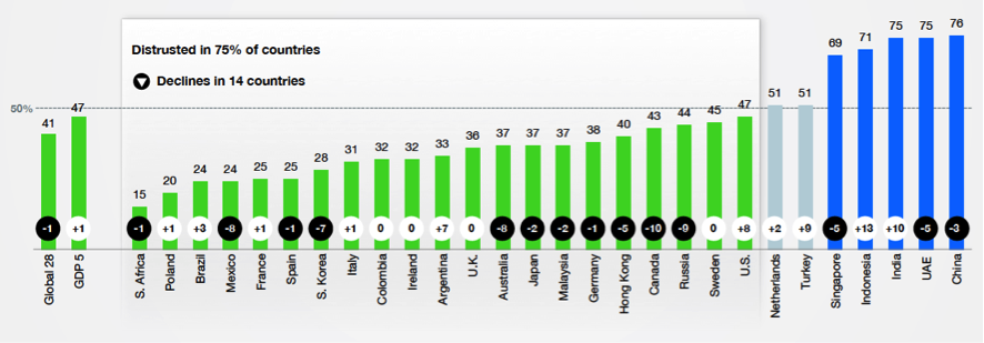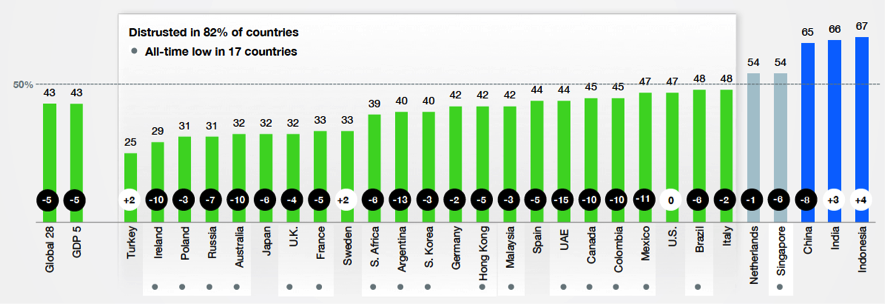 Es informe señala que dos tercios de los países examinados se han vuelto «desconfiados» (o lo que es lo mismo, con menos del 50% de confianza en las principales instituciones de negocios, gobierno, medios de comunicación y ONG’s), mientras que en el estudio anterior eran sólo un poco más de la mitad.