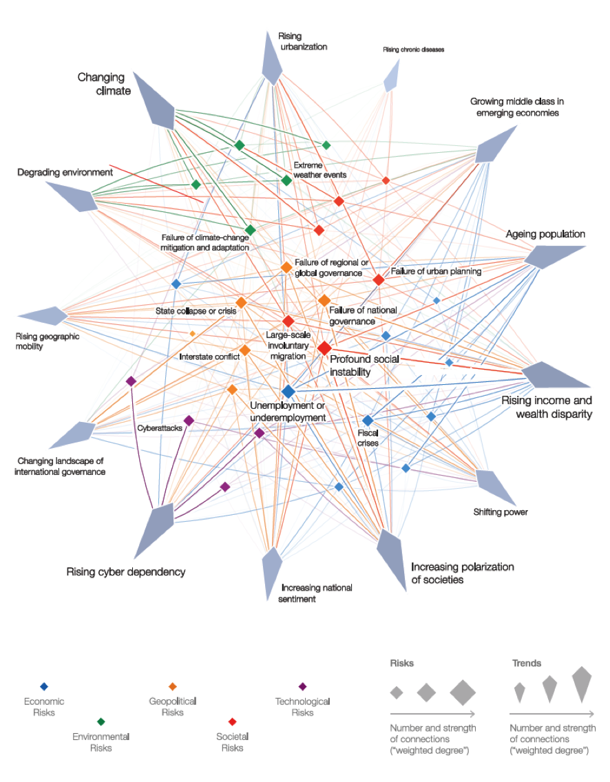 En el siguiente gráfico se pueden observar las interrelaciones entre estas tendencias y los riesgos antes mencionados (y también otros de menos impacto y/o probabilidad de ocurrencia).