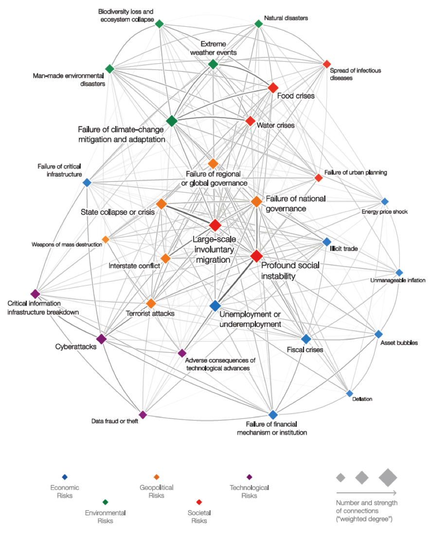 No podemos considerar los riesgos como si estos fueran una suerte de entidades independientes sin ninguna relación entre ellas. El hecho de que un riesgo llegue a materializarse o no condiciona que otros también lo hagan con una probabilidad de ocurrencia y un impacto dependientes al resto. Es decir, los riesgos están relacionados y tras solicitar a los encuestados que identificaran entre tres y seis pares de riesgos globales que creían que estaban más interconectados se llegó al siguiente gráfico.