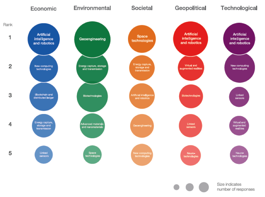 Los encuestados tuvieron que pronunciarse al respecto de cómo las nuevas tecnologías contribuyen a aumentar esos riesgos globales y el resultado puede observarse en el siguiente gráfico, en el que la inteligencia artificial y la robótica se colocan en la primera posición a la hora de contribuir a magnificar los riesgos económicos, geopolíticos y tecnológicos.