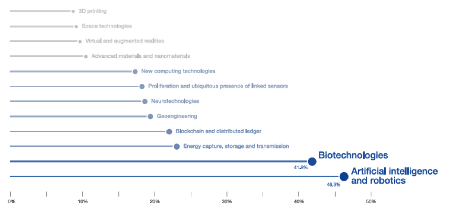 El informe tiene en cuenta esa preocupación y cuando pregunta a los encuestados que cuáles de esas tecnologías creen que deben tener una mejor gobernanza, el resultado es que la inteligencia artificial y la robótica junto a la biotecnología se destacan claramente del resto, como vemos a continuación.