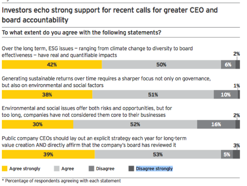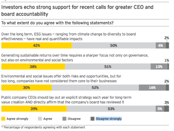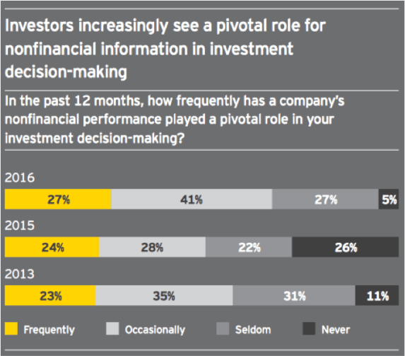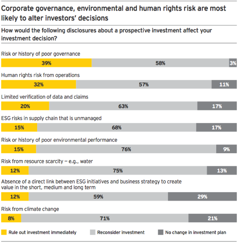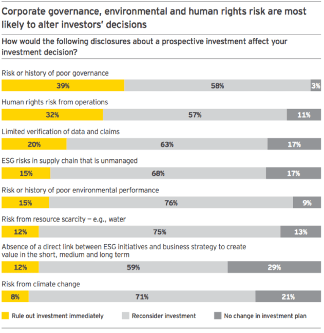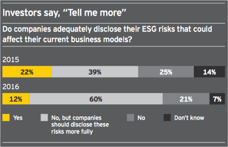 Por ejemplo, cuando se preguntó a los inversores sobre cómo la divulgación del riesgo de una posible inversión o un caso de mal gobierno corporativo afectaría una decisión de inversión, el 39% de los encuestados en la encuesta de 2016 dijo que la descartaría inmediatamente, comparado con el 27% en 2015 y el 30% en 2013.
