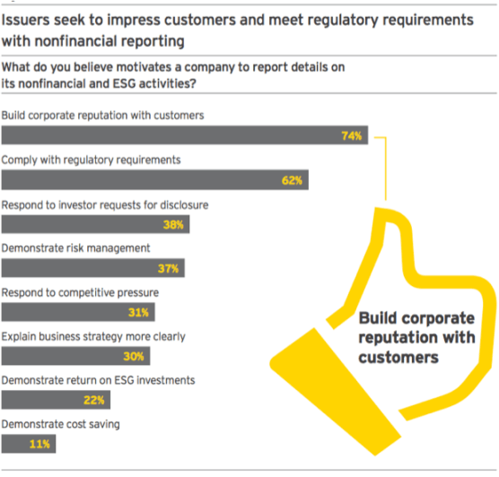 La cuestión no financiera más importante para los inversores en la encuesta estaba relacionada con la «buena ciudadanía corporativa y las políticas de los emisores sobre ética empresarial», con un 35% de los encuestados calificando esa cuestión como «muy importante». La demanda de los clientes para obtener más información estaba casi en el mismo nivel, con el 31% calificándolo como «muy importante» y el 60% como «importante».