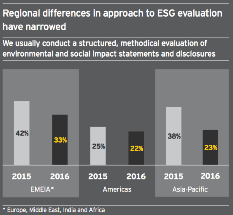 Considerando, por ejemplo, el uso de un «enfoque estructurado y metódico para evaluar las informaciones y declaraciones sobre impacto ambiental y social», en 2015, el 25% de los encuestados americanos informó que utilizó un enfoque altamente estructurado, comparado con el 42% de los europeos y el 38% de los asiáticos.