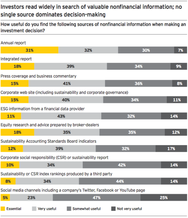 Los puntos de vista de los inversores al respecto de la calidad de la información no financiera proporcionada por las organizaciones han de servir como una llamada de alarma a los directores financieros y a sus pares corporativos dedicados a buscar la atención de los inversores institucionales.