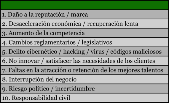 Según el estudio, los diez riesgos principales que amenazan a las empresas son: