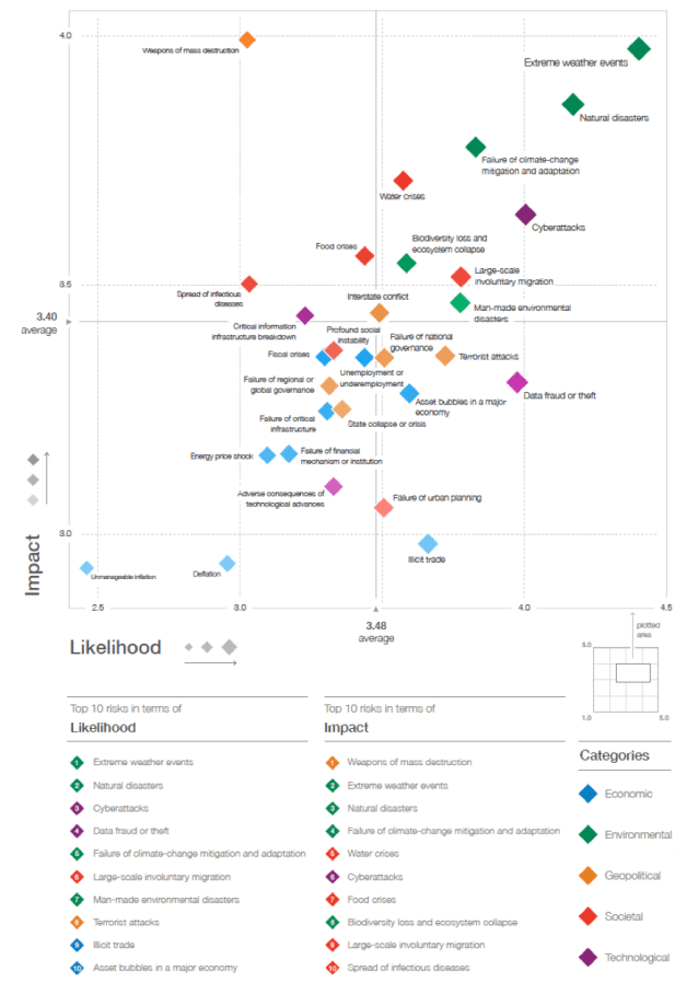 Algo así puede suceder con la materialización más profunda del cambio climático que puede llevar a severas consecuencias en todas las categorías que el informe tiene en cuenta (económica, medioambiental, geopolítica, social, y – en menor medida – tecnológica).