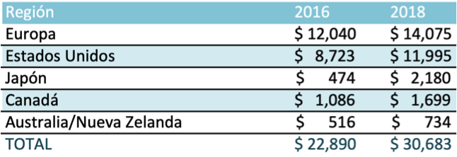 A comienzos de 2018, la inversión global sostenible alcanzó 30,7 billones de dólares americanos en los cinco mercados principales que se muestran en la figura, lo que representa un aumento del 34% en dos años.