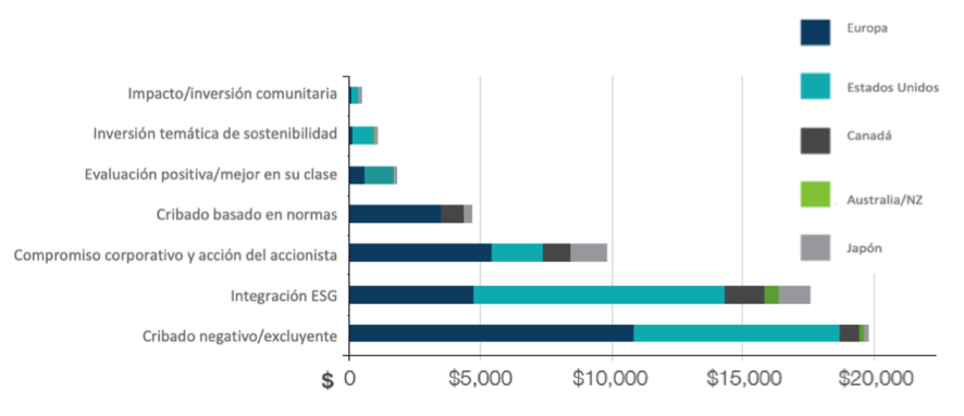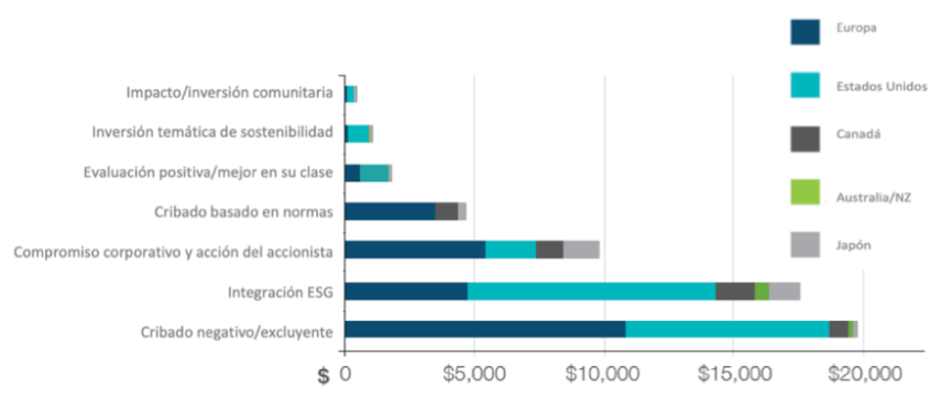 La evaluación negativa es la estrategia más usada en Europa, mientras que la integración ASG controla la mayoría de los activos en los Estados Unidos, Canadá, Australia y Nueva Zelanda.
