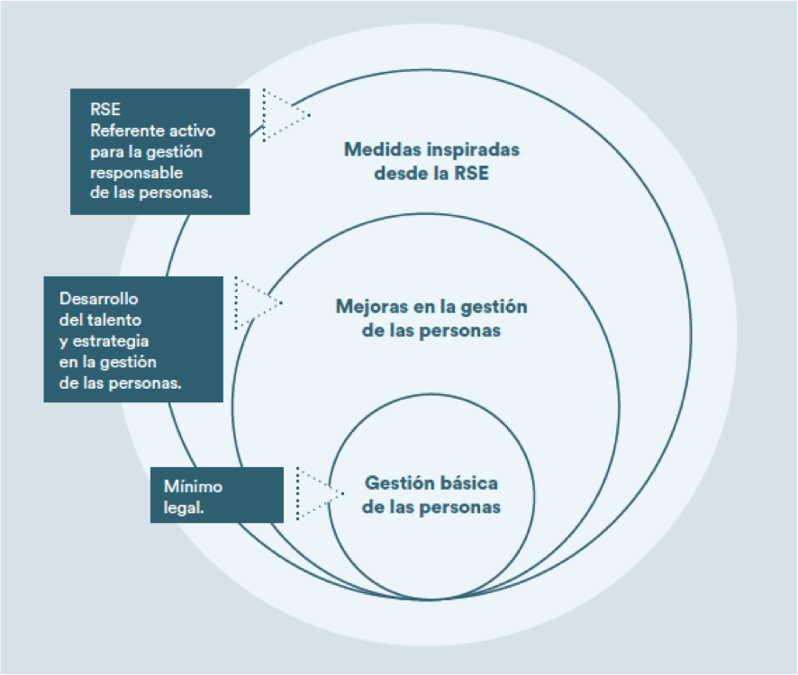 Iniciándose en un nivel de “mínimo legal” (en el que simplemente se cumple la normativa legal exigible en las políticas de RR.HH.), pasando por el nivel de mejoras de la gestión (con medidas orientadas solo a la gestión de Personas), hasta el momento de establecer medidas inspiradas desde la RSE que partan de una visión transversal, ética y de largo plazo.