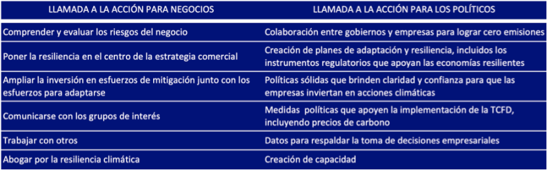Llamadas a la acción para conseguir la resiliencia climática. Fuente: Traducción de “Thriving through the transformation”.