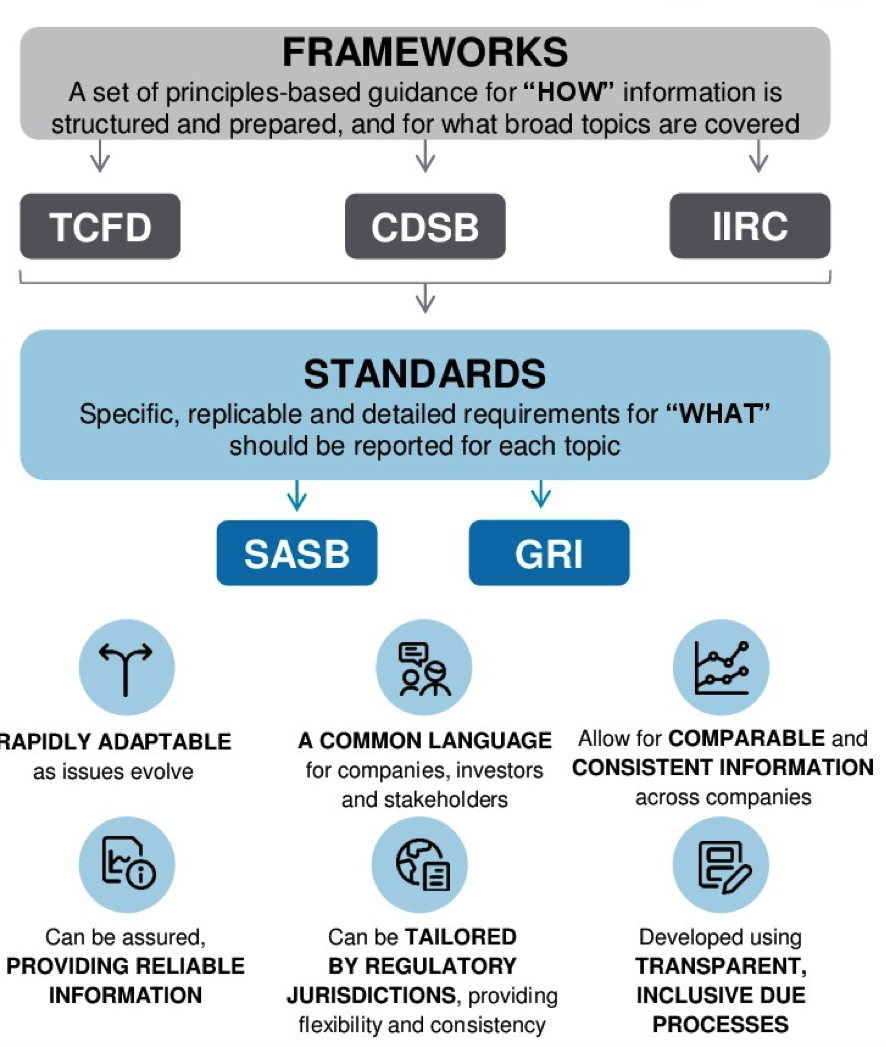 Las normas hacen que los marcos sean factibles y ayudan a lograr factores clave de éxito en la presentación de informes no financieros. Fuente: SASB.