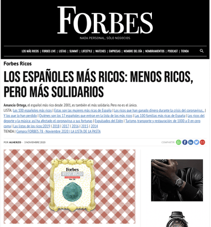 En el mes de octubre me contactó Àlvar Hernández para dar mi opinión en el artículo “Los españoles más ricos: menos ricos, pero más solidarios”, publicado dentro del número 78 de la revista Forbes perteneciente al mes de noviembre-diciembre de 2020.