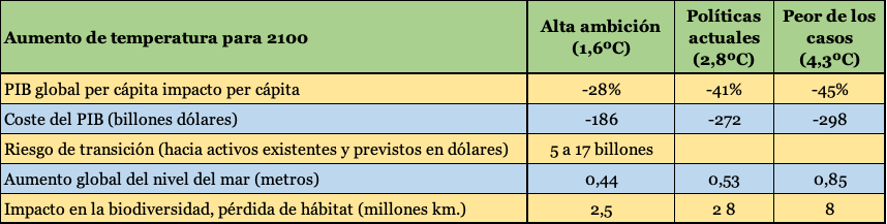 Sobre la base de un conjunto de escenarios empleados por el Grupo Intergubernamental de Expertos sobre el Cambio Climático (IPCC), denominados «vías socioeconómicas compartidas», se deduce que la no mitigación del cambio climático podría reducir el PIB mundial per cápita en un 45% para 2100, en comparación con un escenario en el que el cambio climático no fuera a más.