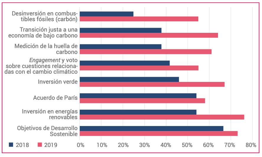 En cuanto al desarrollo de estrategias derivadas del desarrollo sostenible y el cambio climático, se aprecia un evidente aumento del porcentaje de entidades con políticas de sostenibilidad en mayor o menor medida, y destaca el crecimiento de la desinversión en combustibles fósiles y una economía baja en carbono, pero también aumentan las políticas relacionadas con el Acuerdo de París o los Objetivos de Desarrollo Sostenible (ODS).