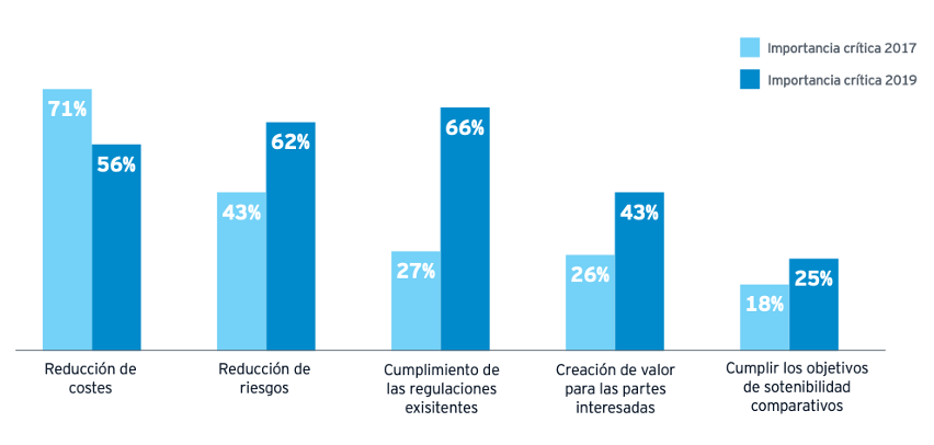Como ejemplo de cómo lo anterior acaba permeando en las organizaciones, el cumplimiento con la regulación ha pasado de no tener apenas importancia para las empresas en 2017, a ser un tema crítico para las compras sostenibles en 2019, como se puede ver en el siguiente gráfico.