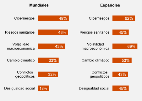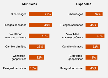 Los riesgos o amenazas que más preocupan a los CEOs y el impacto que creen que tendrán en su negocio en los próximos meses revelan, al igual que el año pasado, que están más preocupados por los riesgos cibernéticos (49%) y por la situación sanitaria mundial (48%), ya que la pandemia persiste.