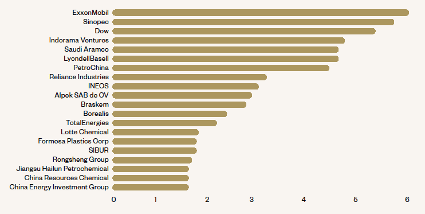 La lista de las 20 principales empresas petroquímicas que producen polímeros vírgenes destinados al plástico de un solo uso no ha cambiado, siendo Exxonmobil la que más contribuye a la generación de residuos de plástico de un solo uso, seguida de Sinopec y de Dow.